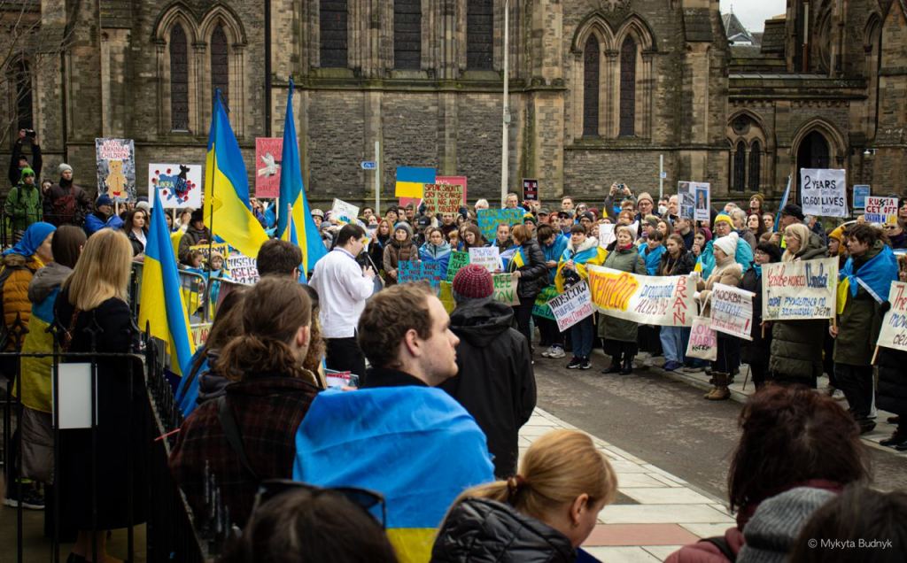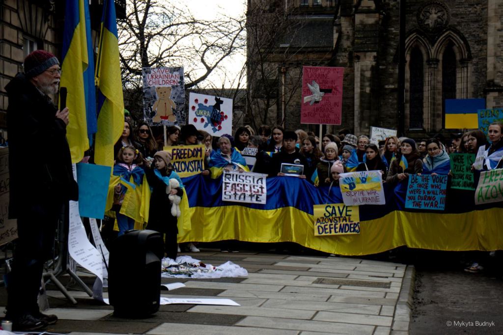 AUGB Edinburgh Ukrainian Club and the Ukrainian Consulate in Edinburgh attended the demonstration addressing everyone with a speech on the importance of continued political pressure on Russia and Russian diplomats in Scotland. AUGB Edinburgh (Association of Ukrainians in Great Britain Edinburgh) leader Hannah Beaton Hawryluk came to the demo and spoke on the ongoing support for Ukrainians in Scotland highlighting they will continue advocating for Ukraine.