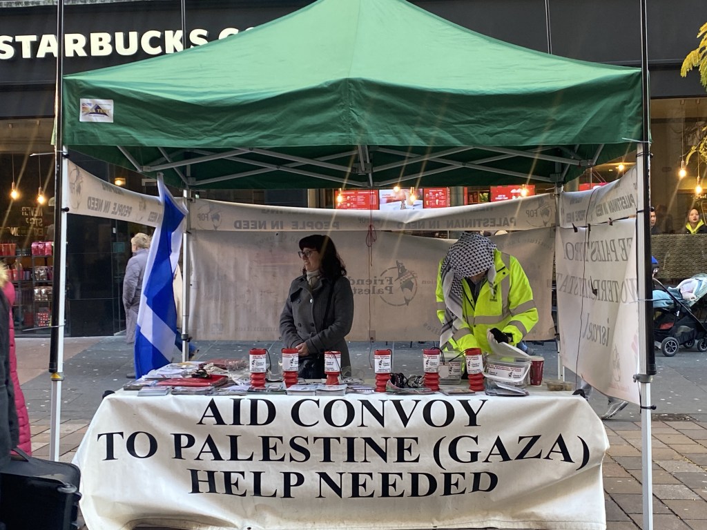 Apart from individual protesters, there were a lot of charities collecting costs for humanitarian causes in Gaza. We talked to one of them ‘Friends of Palestine‘, a Scottish-based charity that has operated for 7 years, since 2015. Beginning on October 7, 2023, ‘Friends of Palestine’ come out on Buchanan Street every Saturday from 10 a.m. to 6 p.m. to raise funds for Palestinians in need.