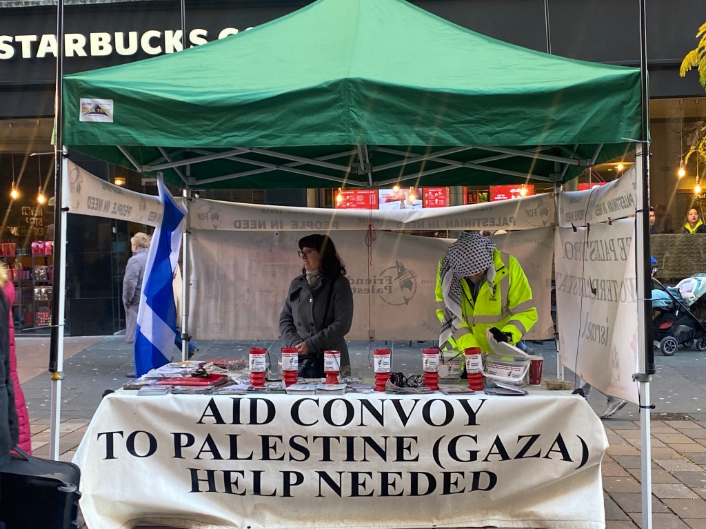 Apart from individual protesters, there were a lot of charities collecting costs for humanitarian causes in Gaza. We talked to one of them ‘Friends of Palestine’, a Scottish-based charity that has operated for 7 years, since 2015. Beginning on October 7, 2023, ‘Friends of Palestine’ come out on Buchanan Street every Saturday from 10 a.m. to 6 p.m. to raise funds for Palestinians in need.